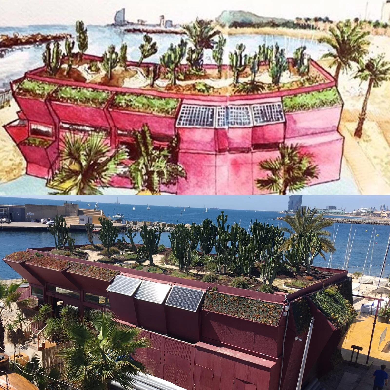 Había soñado con cubrir de plantas las cubiertas de Barcelona, pero nunca pensé que acabaría realizando una llena de cactus. El emblemático restaurante Red Fish, situado en un lugar privilegiado en la misma playa de Barcelona, apostaba fuerte por ser visto. Por eso después de un necesario estudio de carga del tejado de la estructura, decidimos plantar un jardín de cactus y mini jardines de planta suculenta para cubrir las alas de esta edificación tan especial. Todavía hoy cuando paso por delante, me sorprende verlo, no os lo perdáis.